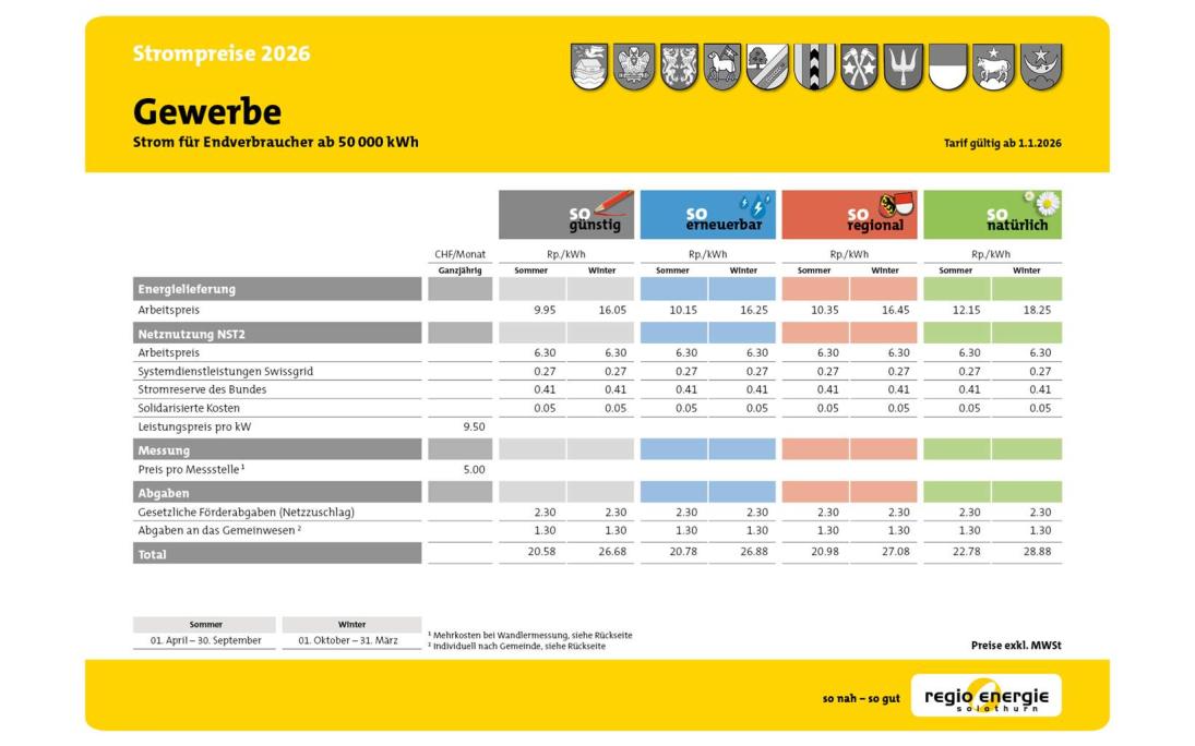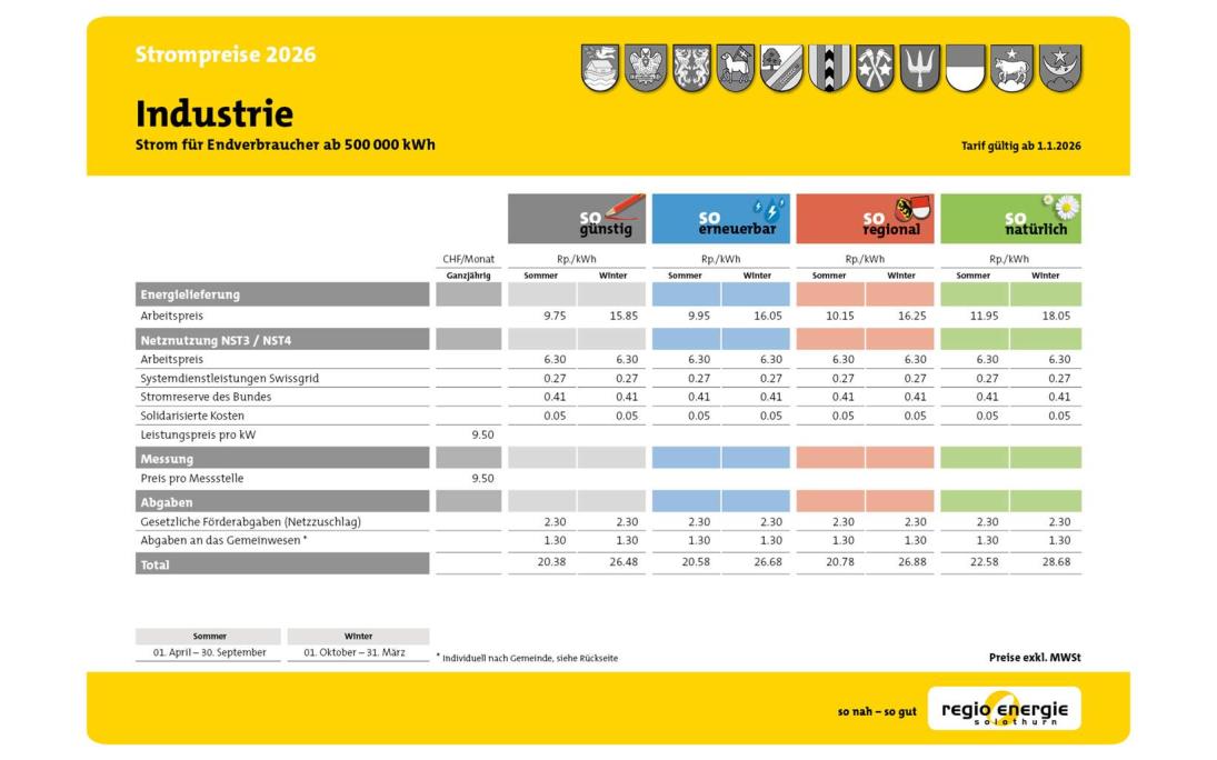 Strompreise Langendorf, Leuzigen, Lommiswil, Lüsslingen-Nennigkofen, Lüterkofen-Ichertswil, Schnottwil, Subingen, Zuchwil 2024/2025