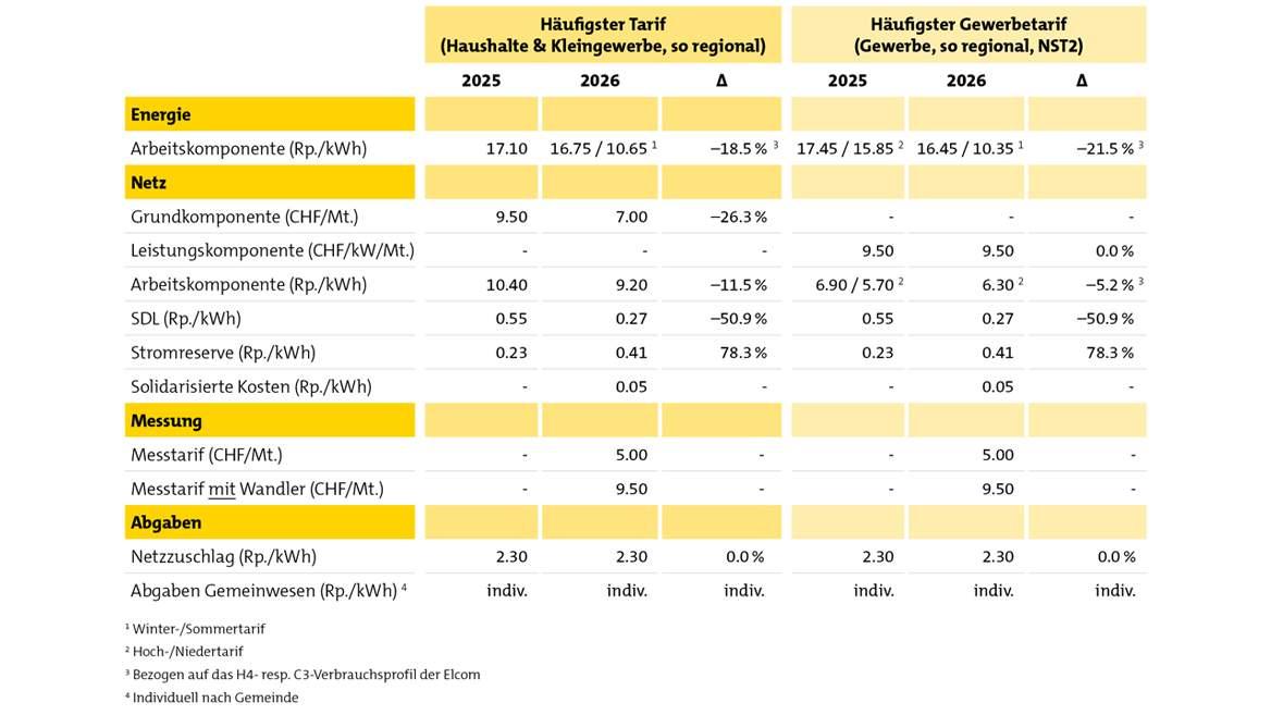 Im Vergleich zum Vorjahr steigen die eintarifierten Kosten im Netz um 1.59 %, in der Energielieferung sinken sie um 17.65 %. Der  Strompreis sinkt durchschnittlich um 3.0 Rp./kWh (–9.5 %). Ein Fünf-Zimmer-Haushalt mit Elektroherd und Tumbler mit einem  jährlichen Verbrauch von 4 500 kWh (ElCom-Verbrauchskategorie H4) und dem Standardprodukt «so regional» bezahlt im Vergleich zum Vorjahr in Summe 131 Franken weniger für den Strom.