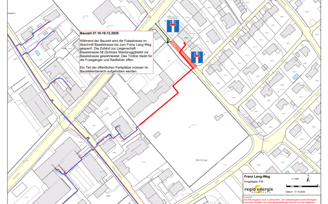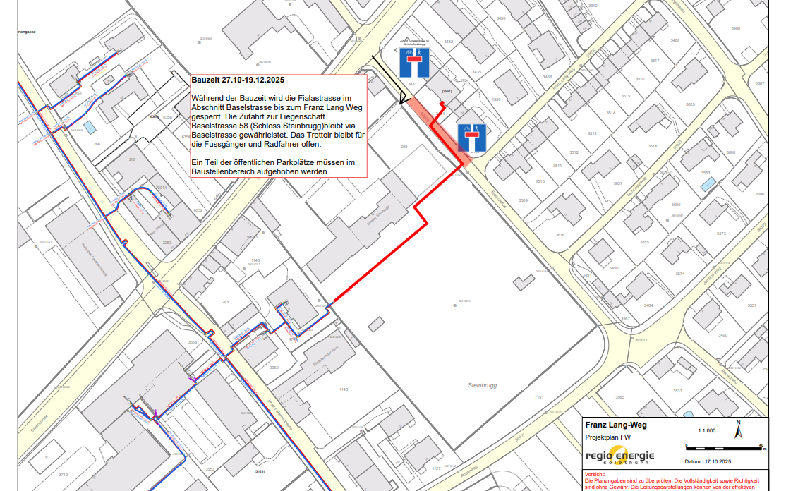 Während der Bauzeit wird die Fialastrasse im Abschnitt Baselstrasse bis zum Franz Lang Weg gesperrt. Die Zufahrt zur Liegenschaft Baselstrasse 58 (Schloss Steinbrugg) bleibt via Baselstrasse gewährleistet. Das Trottoir bleibt für die Fussgänger/-innen und Radfahrer/-innen offen.