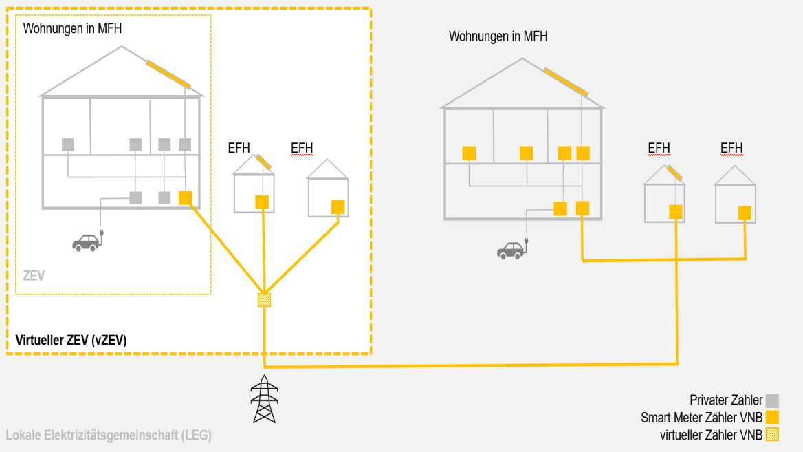Seit dem 1. Januar 2025 kann ein virtueller Zusammenschluss zum Eigenverbrauch (vZEV) realisiert werden. Ein virtueller Zusammenschluss zum Eigenverbrauch (vZEV) ermöglicht es mehreren Verbraucherinnen und Verbrauchern, gemeinsam den selbst produzierten Strom – meist aus Photovoltaikanlagen – zu nutzen, ohne physisch miteinander verbunden zu sein.