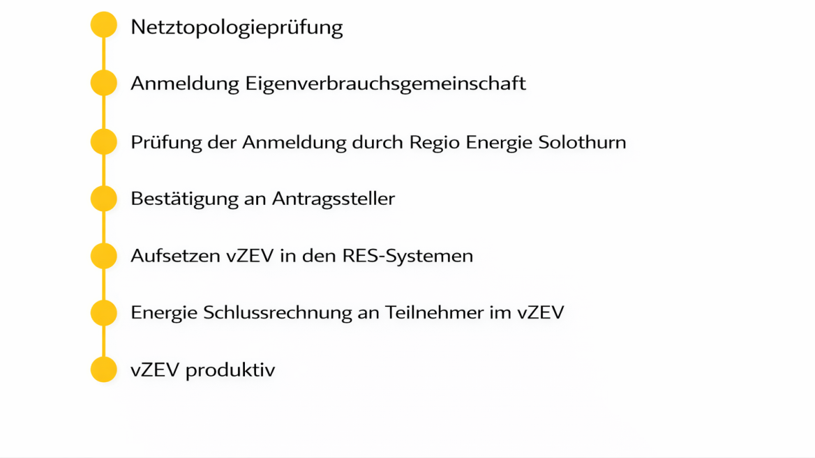 Durch den Einsatz von Smart Metern wird dabei ein virtueller Messpunkt gebildet. Rechnerisch wird ermittelt, welche Strommenge aus dem Stromnetz der Regio Energie Solothurn bezogen und welche rückgespiesen wird. Für die Abrechnung innerhalb des vZEV werden die Messdaten der teilnehmenden Parteien an die Ansprechperson oder den Dienstleister des vZEV geliefert. Der virtuelle Messpunkt wird an die verantwortliche Ansprechperson des vZEV verrechnet.